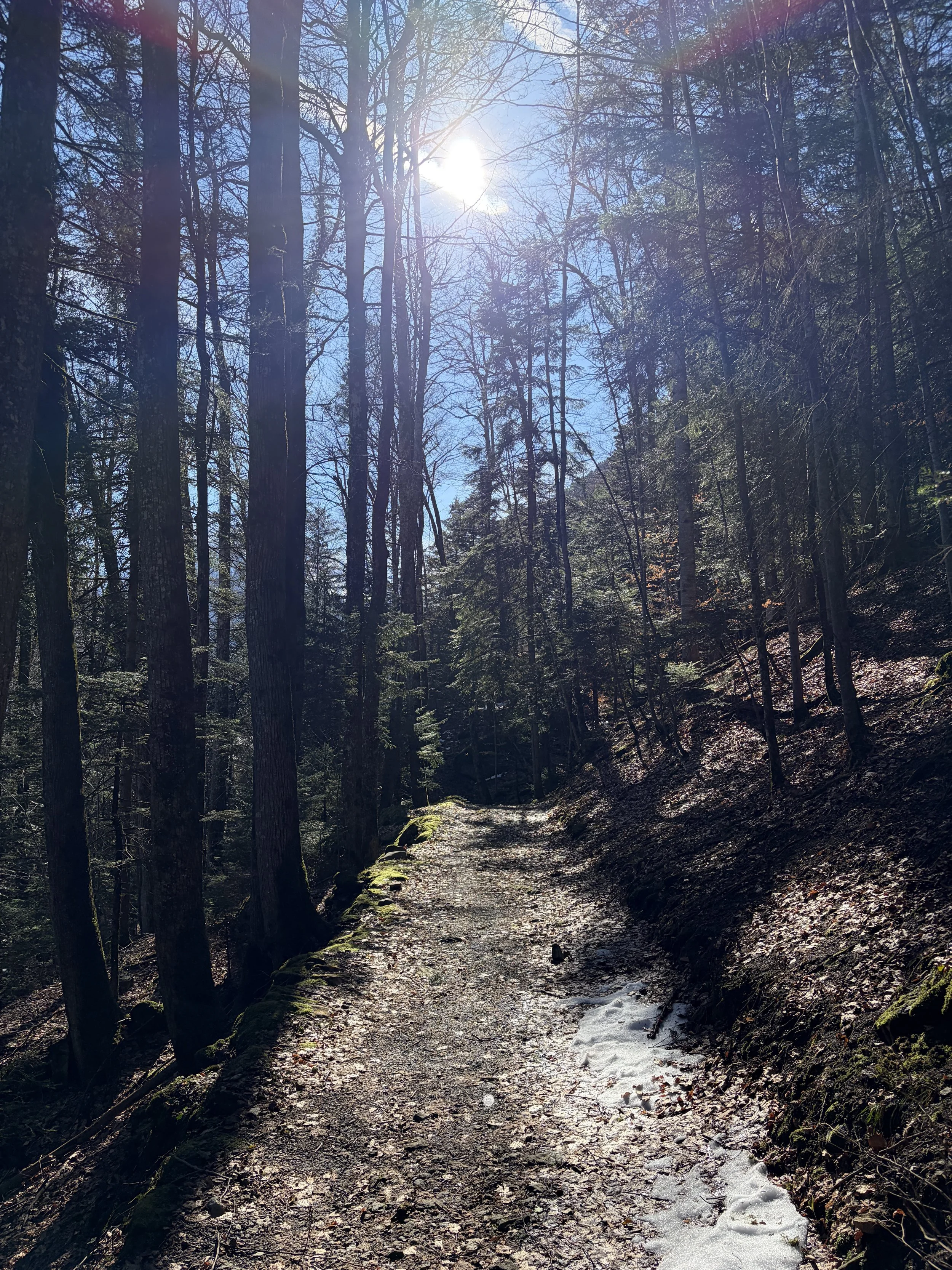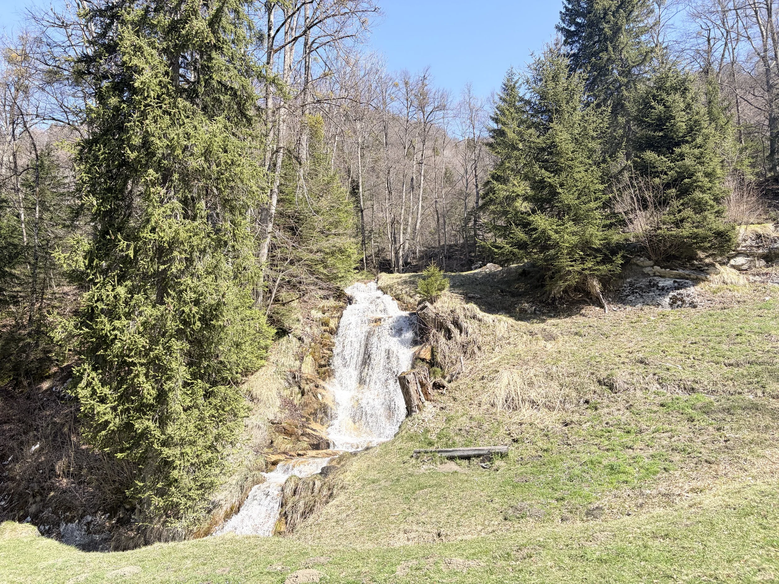 Unterwegs zeigt sich der Frühling vorsichtig, aber bestimmt. An Buchen spriesst das erste zarte Grün, fast durchsichtig im Licht. Es ist noch kein dichter Wald, eher ein Versprechen. Gleichzeitig sind die Geräusche bereits da: Vögel, die zwitschern und den Hang mit Leben füllen, und darunter das stetige Rauschen der Bäche, welche jetzt voller Schmelzwasser sind. Ein Tosen, das einen begleitet, auch wenn man es nicht mehr direkt sieht.