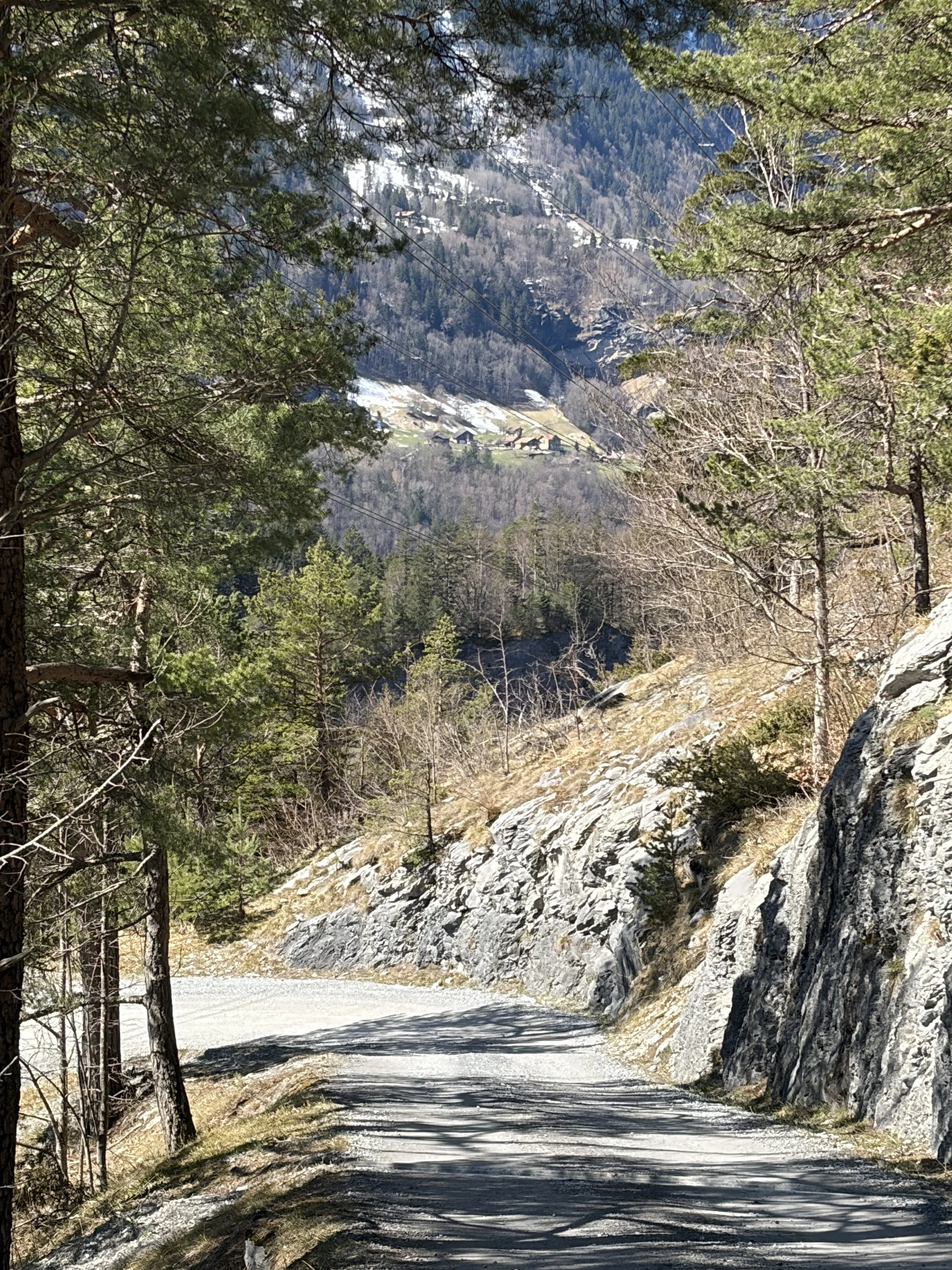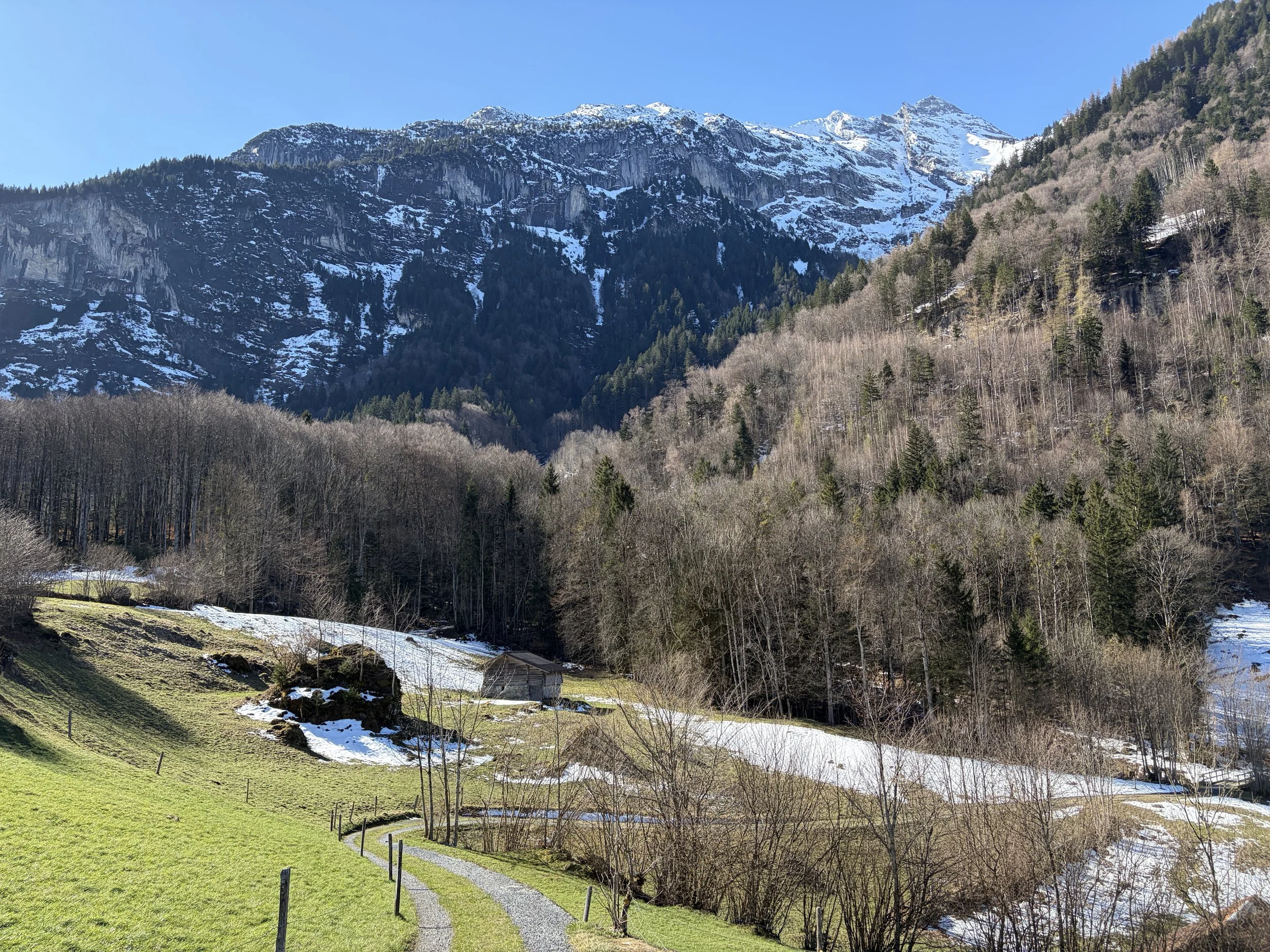 Pünktlich auf Ostern wird es warm. Auf der Höhe der Schwendi sind die Wege grösstenteils schneefrei, und doch liegt der Winter noch in den Schatten, in Mulden, an Waldrändern. Genau diese Mischung macht es aus. Man geht los, ohne grosses Ziel, ohne Gepäck. Direkt vor der Haustür steigt der Weg an, zuerst steil, dann angenehmer, bis er sich quer über den Hang legt und den Blick langsam freigibt.